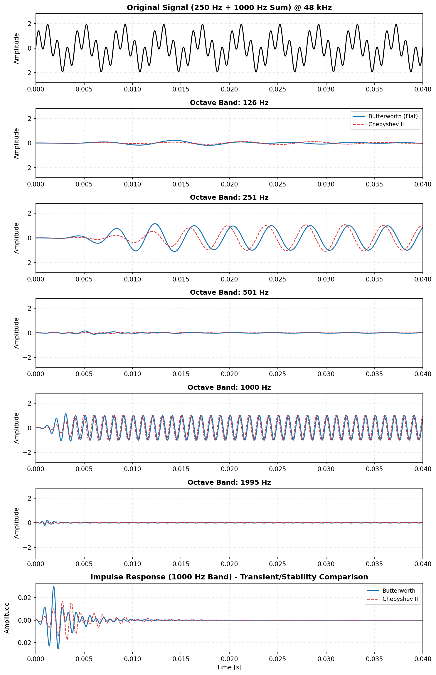 Why do the signals look shifted in time? Digital IIR filters (like Butterworth or Chebyshev) have non-linear phase responses, which results in frequency-dependent Group Delay. In the 250 Hz band, you can see that the Chebyshev II filter has a different propagation delay compared to the Butterworth filter. This is a normal physical property of these architectures: more aggressive frequency roll-offs usually come at the cost of higher group delay and phase distortion.