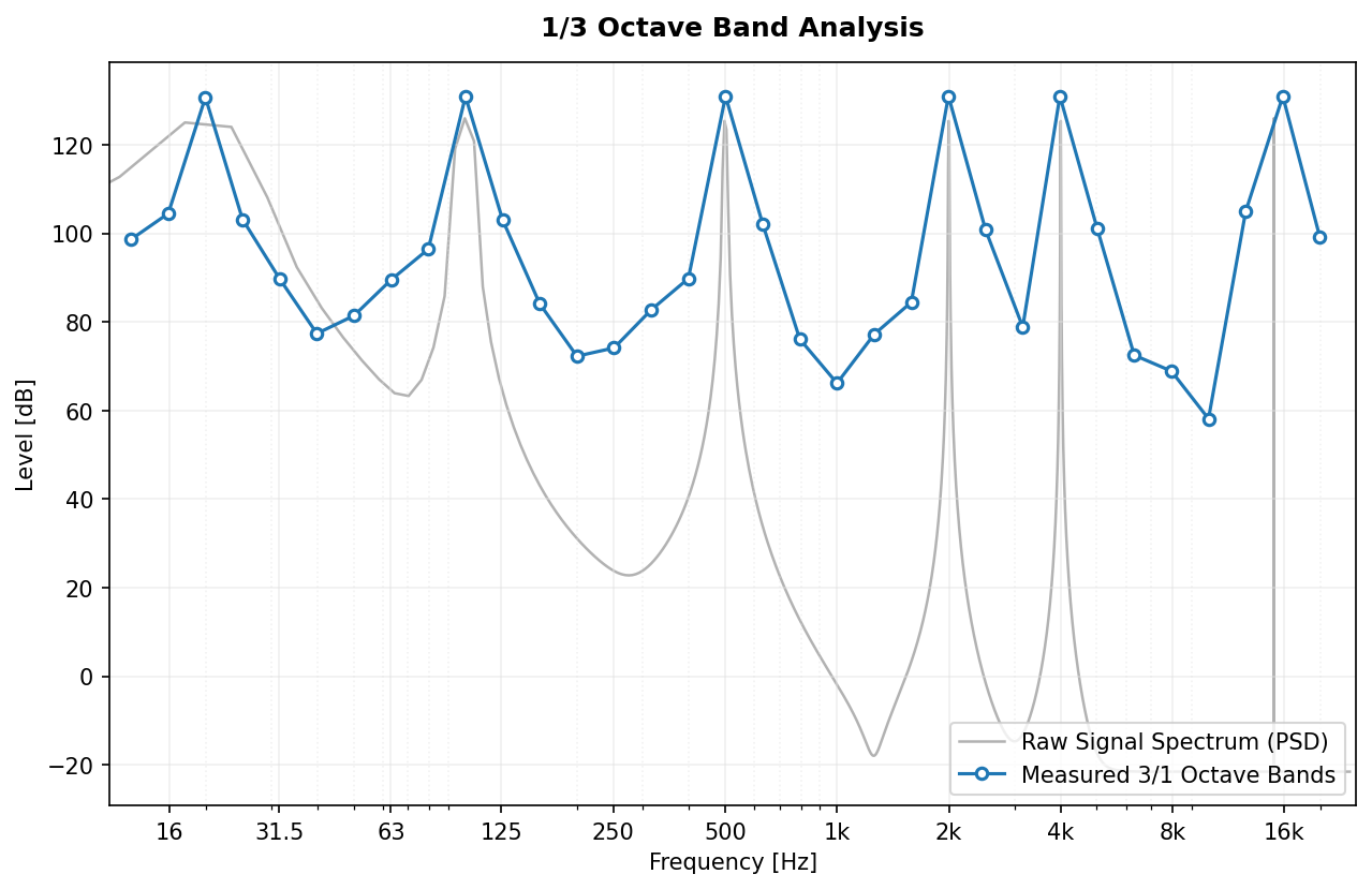 spl, freq = octavefilter(signal, fs=fs, fraction=3)Example of a 1/3 Octave Band spectrum analysis of a complex signal.
