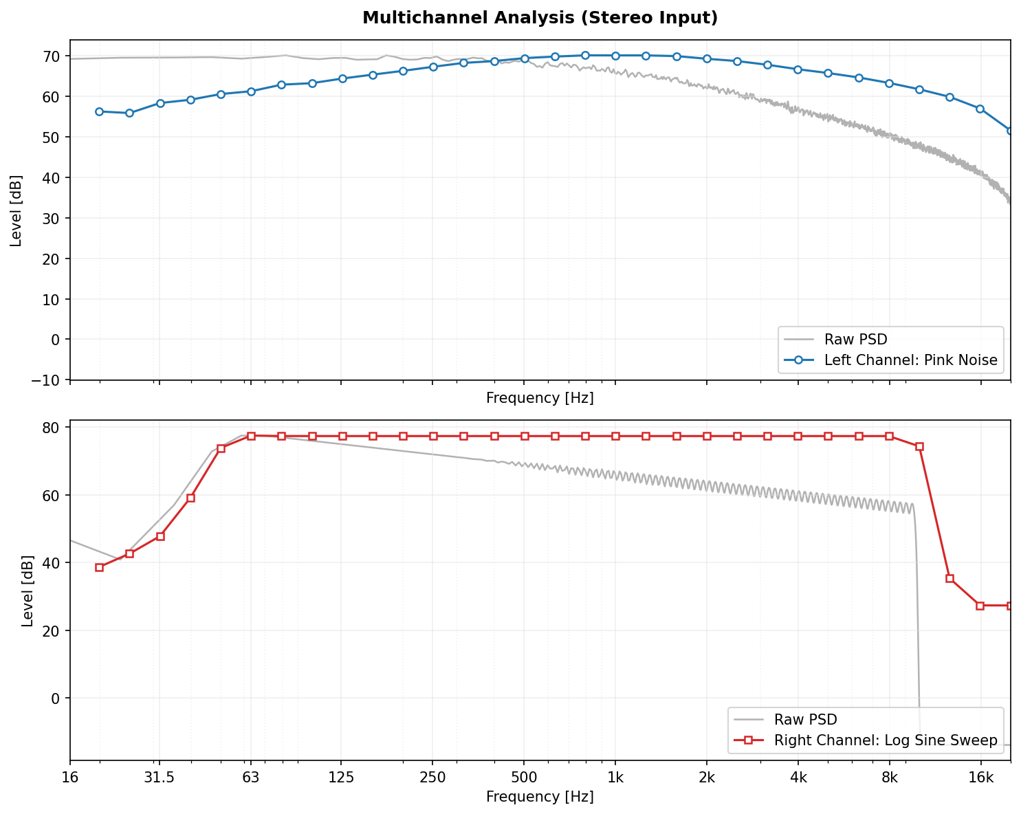 Simultaneous analysis of a Stereo signal: Left Channel (Pink Noise) vs Right Channel (Log Sine Sweep).