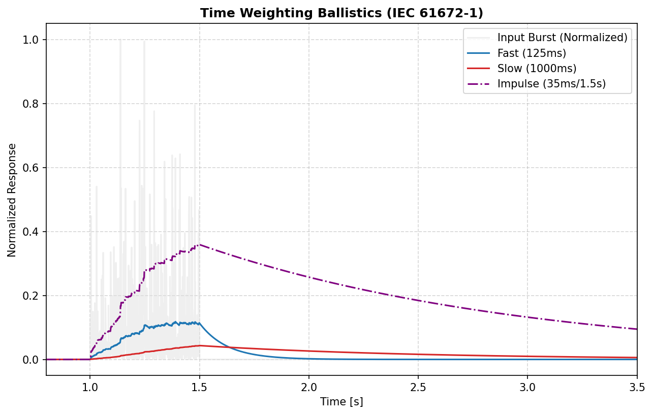 c_weighted_signal = weighting_filter(signal, fs, curve='C')Accurate SPL measurement requires capturing energy over specific time windows. PyOctaveBand implements exact time constants per IEC 61672-1:2013.