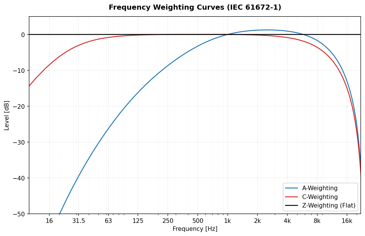 - Weighting Response: Checks gains at 100Hz (-19.1dB for A) and 1kHz (0dB).