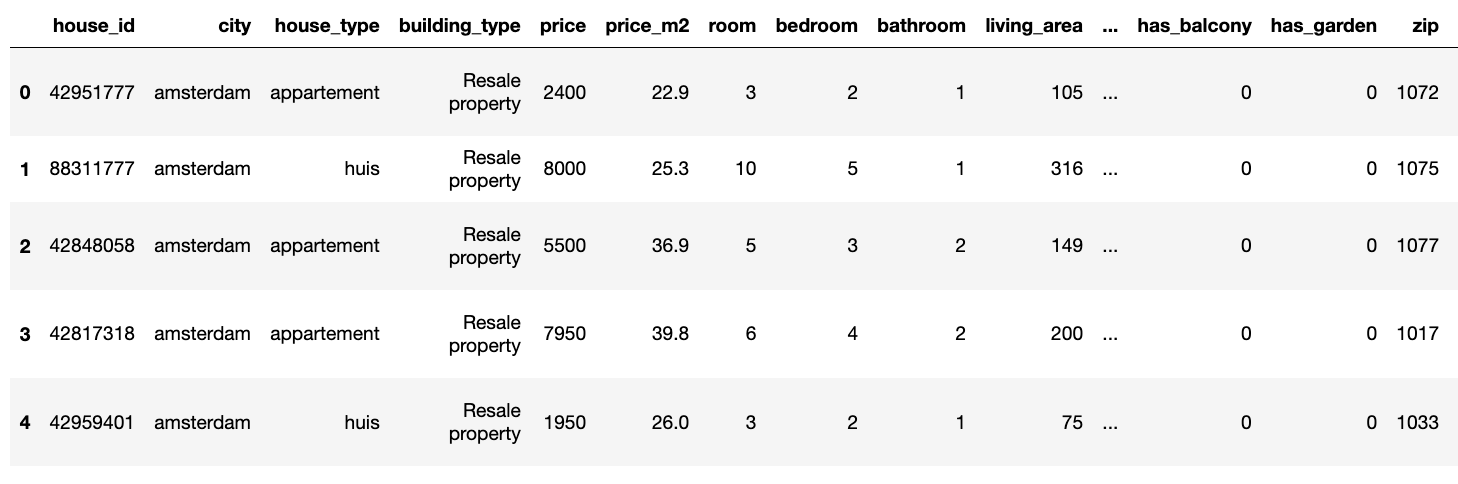 area: Specify the city or specific area you want to look for, eg. Amsterdam, Utrecht, Rotterdam, etcwant_to: You can choose eitherbuyorrent, which finds houses either for sale or for rent.find_past: Specify whether you want to check the historical data. The default isFalse.n_pages: Indicate how many pages you want to look up. The default is1.