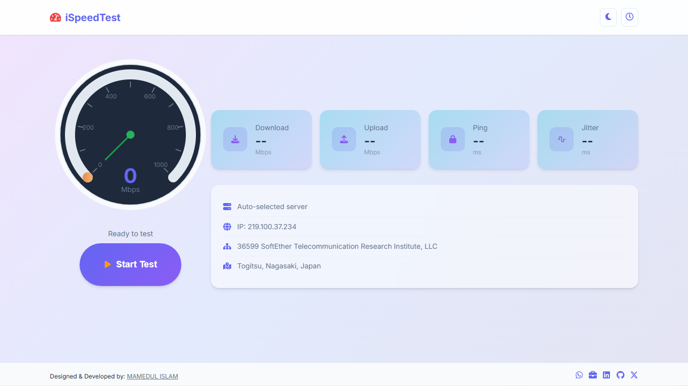 Meta Description: Test your internet speed including download, upload, ping, and jitter. Lightweight PWA with offline support. Built by Mamedul.