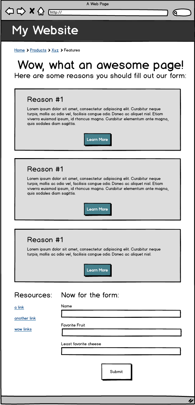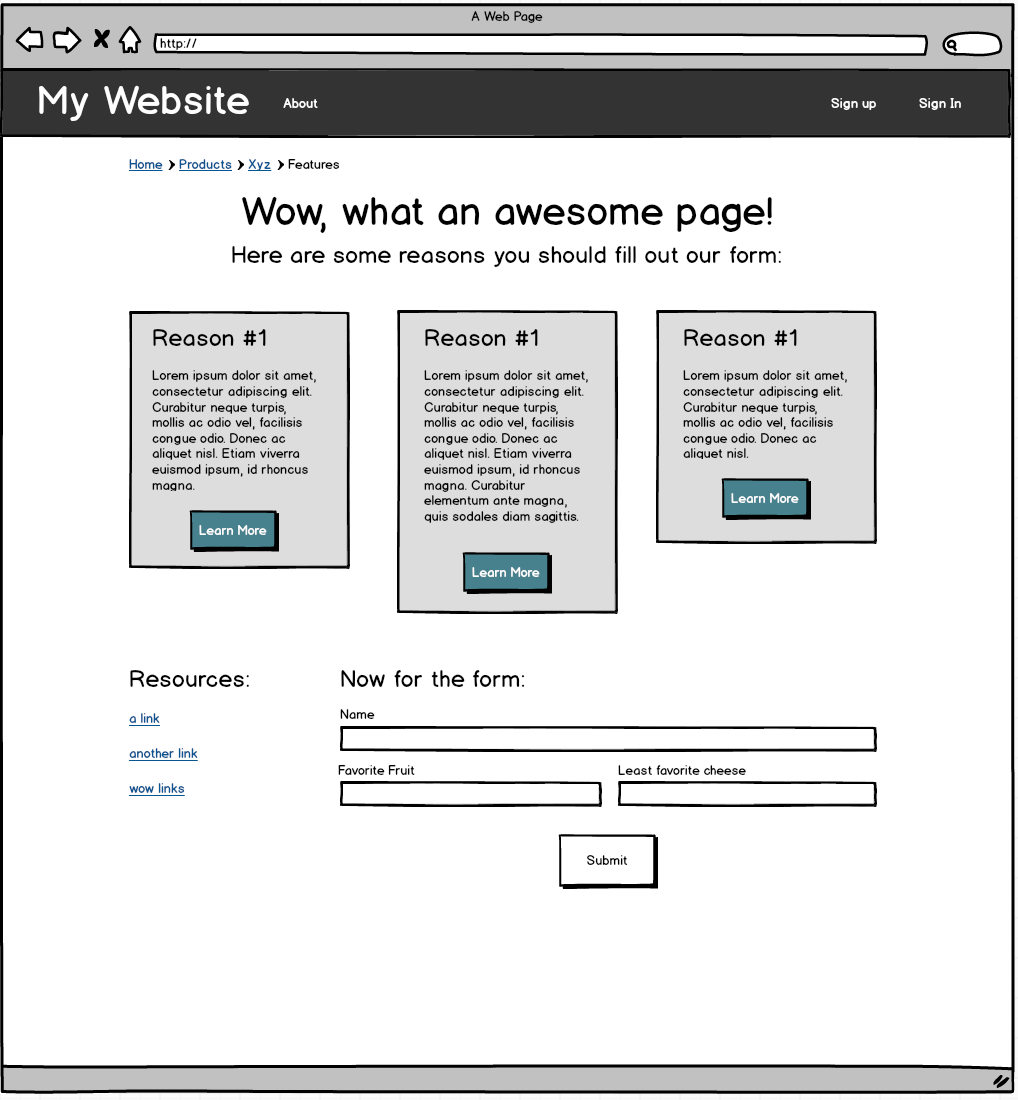 From here, try to use the tools we've gone over above, along with the Foundation documentation, to complete the rest of the wireframe. Specifically check out Foundation's docs on vertical menus and forms. For the form section, make good use of Foundation's grid system.