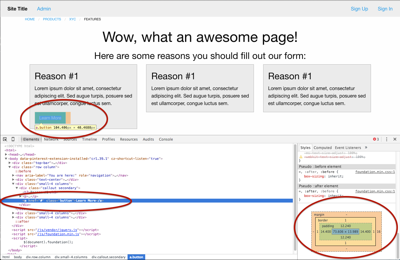 Foundation has a nice section on how to make pretty-looking buttons - pretty much, the secret is to take a link and put the class button on it. So let's do that inside each of our panels: