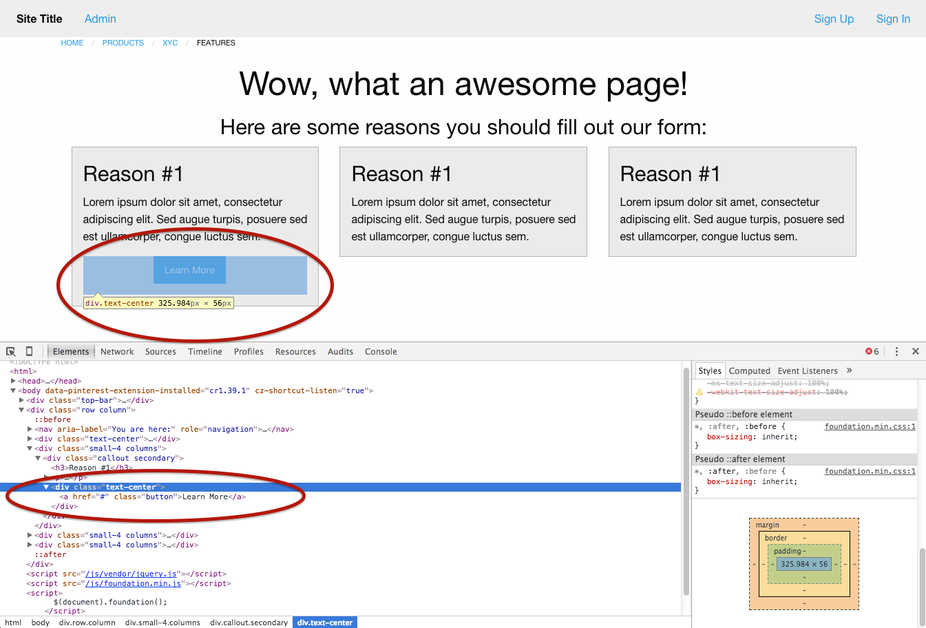 <h3>Here are some reasons you should fill out our form:</h3>But wait! Our text isn't centered! Luckily, Foundation has a handful of helper classes to help center text alignment. Read about them here. Adding the helper class text-center to something will try to center the text-alignment of all its contents.