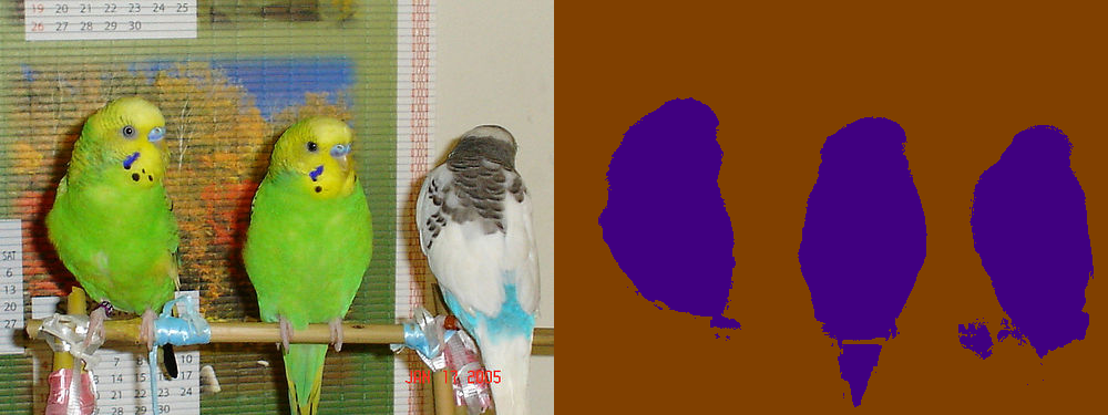 Employed model was trained without CRF in phase 1 (24,000 iterations) and then in phase 2 (12,000 iterations), but results here exploited DENSE_CRF layer. Displayed images (bird: 2010_004994, bottle: 2007_000346, chair: 2008_000673) are part of validation dataset stored in $DEEPLAB/exper/voc12/list_subset/val.txt. Colors of segments differ from original ground truth labels because employed model was trained only for 3 classes + background.