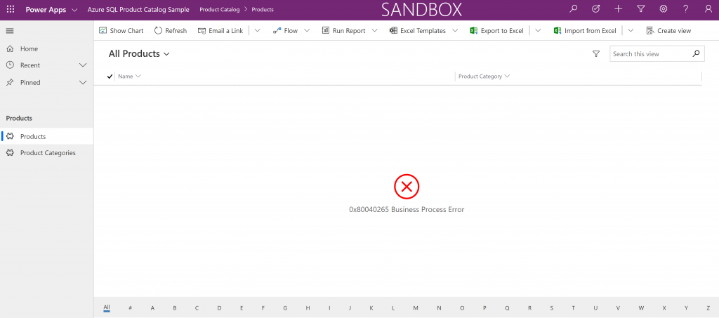 - After the Solution has been imported you should see a new Model Driven App under Apps called "Azure SQL Product Catalog Sample"