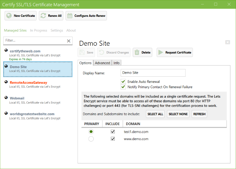 - Click 'New Certificate', choose your IIS site (which must have 1 or more hostname bindings set). Save your settings and click 'Request Certificate'