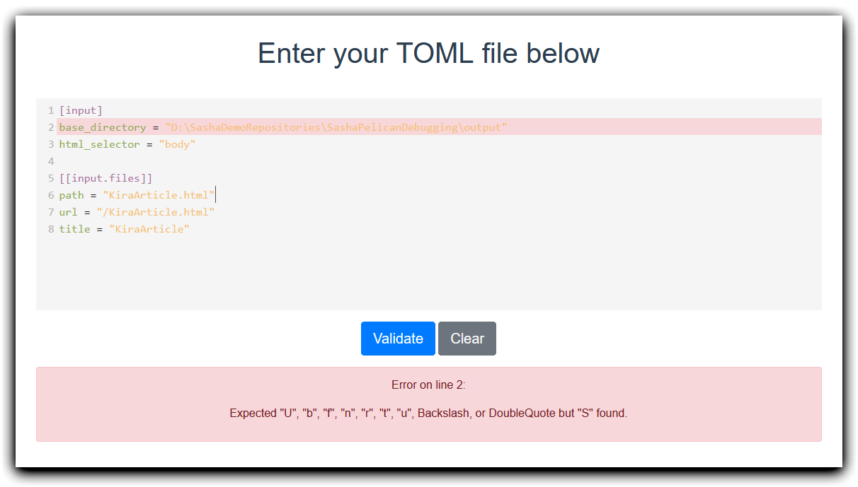 D:\SashaDemoRepositories\SashaPelicanDebugging>pelican content -s pelicanconf.py --fatal warnings --ignore-cache --debug [11:23:23] DEBUG Pelican version: 4.8.0 __init__.py:531 DEBUG Python version: 3.10.6 __init__.py:532 DEBUG Adding current directory to system path __init__.py:66 DEBUG Finding namespace plugins _utils.py:81 DEBUG Namespace plugins found: _utils.py:84 pelican.plugins.search pelican.plugins.sitemap DEBUG Loading plugin `search` _utils.py:90 DEBUG Registering plugin `pelican.plugins.search` __init__.py:73 DEBUG Found generator: ArticlesGenerator (internal) __init__.py:209 DEBUG Found generator: PagesGenerator (internal) __init__.py:209 DEBUG Found generator: SearchSettingsGenerator (pelican.plugins.search.search) __init__.py:209 DEBUG Found generator: StaticGenerator (internal) __init__.py:209 DEBUG Template list: ['!simple/archives.html', '!simple/article.html', '!simple/author.html', '!simple/authors.html', '!simple/base.html', '!simple/categories.html', '!simple/category.html', '!simple/gosquared.html', '!simple/index.html', generators.py:70 '!simple/page.html', '!simple/pagination.html', '!simple/period_archives.html', '!simple/tag.html', '!simple/tags.html', '!simple/translations.html', '!theme/analytics.html', '!theme/archives.html', '!theme/article.html', '!theme/article_infos.html', '!theme/author.html', '!theme/authors.html', '!theme/base.html', '!theme/categories.html', '!theme/category.html', '!theme/comments.html', '!theme/disqus_script.html', '!theme/github.html', '!theme/index.html', '!theme/page.html', '!theme/period_archives.html', '!theme/tag.html', '!theme/taglist.html', '!theme/tags.html', '!theme/translations.html', '!theme/twitter.html', 'analytics.html', 'archives.html', 'article.html', 'article_infos.html', 'author.html', 'authors.html', 'base.html', 'categories.html', 'category.html', 'comments.html', 'disqus_script.html', 'github.html', 'gosquared.html', 'index.html', 'page.html', 'pagination.html', 'period_archives.html', 'tag.html', 'taglist.html', 'tags.html', 'translations.html', 'twitter.html'] DEBUG Read file Articles/KiraArticle.md -> Article readers.py:547 DEBUG Signal article_generator_preread.send(ArticlesGenerator) readers.py:560 DEBUG Successfully imported extension module "markdown.extensions.meta". core.py:163 DEBUG Successfully loaded extension "markdown.extensions.meta.MetaExtension". core.py:126 DEBUG Signal article_generator_context.send(ArticlesGenerator, <metadata>) readers.py:627 [11:23:24] DEBUG Read file images/.keep -> Static readers.py:547 DEBUG Signal static_generator_preread.send(StaticGenerator) readers.py:560 DEBUG Signal static_generator_context.send(StaticGenerator, <metadata>) readers.py:627 INFO Writing D:/SashaDemoRepositories/SashaPelicanDebugging/output/feeds/all.atom.xml writers.py:163 INFO Writing D:/SashaDemoRepositories/SashaPelicanDebugging/output/feeds/articles.atom.xml writers.py:163 INFO Writing D:/SashaDemoRepositories/SashaPelicanDebugging/output/feeds/sasha-chernykh.atom.xml writers.py:163 INFO Writing D:/SashaDemoRepositories/SashaPelicanDebugging/output/feeds/sasha-chernykh.rss.xml writers.py:163 INFO Writing D:/SashaDemoRepositories/SashaPelicanDebugging/output/feeds/all-en.atom.xml writers.py:163 INFO Writing D:/SashaDemoRepositories/SashaPelicanDebugging/output/KiraArticle.html writers.py:212 INFO Writing D:/SashaDemoRepositories/SashaPelicanDebugging/output/index.html writers.py:212 INFO Writing D:/SashaDemoRepositories/SashaPelicanDebugging/output/tags.html writers.py:212 INFO Writing D:/SashaDemoRepositories/SashaPelicanDebugging/output/categories.html writers.py:212 INFO Writing D:/SashaDemoRepositories/SashaPelicanDebugging/output/authors.html writers.py:212 INFO Writing D:/SashaDemoRepositories/SashaPelicanDebugging/output/archives.html writers.py:212 INFO Writing D:/SashaDemoRepositories/SashaPelicanDebugging/output/category/articles.html writers.py:212 INFO Writing D:/SashaDemoRepositories/SashaPelicanDebugging/output/author/sasha-chernykh.html writers.py:212 CRITICAL Exception: Search plugin reported Error: Couldn't read the configuration file: Cannot parse config as TOML. Stork recieved error: `invalid escape character in string: `S` at line 2 column 22` __init__.py:566 ┌─────────────────────────────── Traceback (most recent call last) ────────────────────────────────┐ │ C:\Python310\lib\site-packages\pelican\plugins\search\search.py:38 in build_search_index │ │ │ │ 35 │ │ if not which("stork"): │ │ 36 │ │ │ raise Exception("Stork must be installed and available on $PATH.") │ │ 37 │ │ try: │ │ > 38 │ │ │ output = subprocess.run( │ │ 39 │ │ │ │ [ │ │ 40 │ │ │ │ │ "stork", │ │ 41 │ │ │ │ │ "build", │ │ │ │ C:\Python310\lib\subprocess.py:524 in run │ │ │ │ 521 │ │ │ raise │ │ 522 │ │ retcode = process.poll() │ │ 523 │ │ if check and retcode: │ │ > 524 │ │ │ raise CalledProcessError(retcode, process.args, │ │ 525 │ │ │ │ │ │ │ │ │ output=stdout, stderr=stderr) │ │ 526 │ return CompletedProcess(process.args, retcode, stdout, stderr) │ │ 527 │ └──────────────────────────────────────────────────────────────────────────────────────────────────┘ CalledProcessError: Command '['stork', 'build', '--input', 'D:\\SashaDemoRepositories\\SashaPelicanDebugging\\output\\search.toml', '--output', 'D:\\SashaDemoRepositories\\SashaPelicanDebugging\\output/search-index.st']' returned non-zero exit status 1. During handling of the above exception, another exception occurred: ┌───────────────
