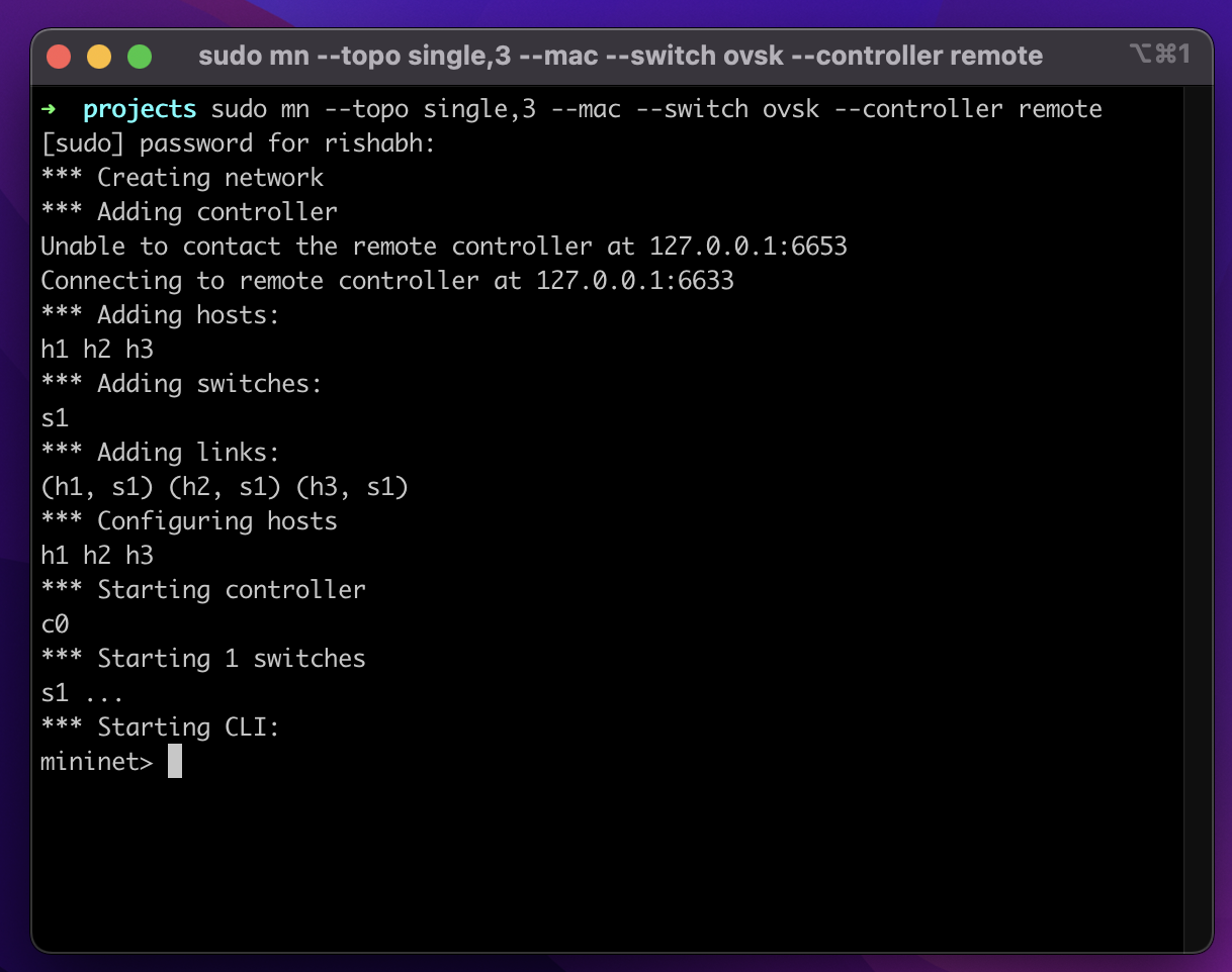 $ sudo mn --topo single,3 --mac --switch ovsk --controller remote