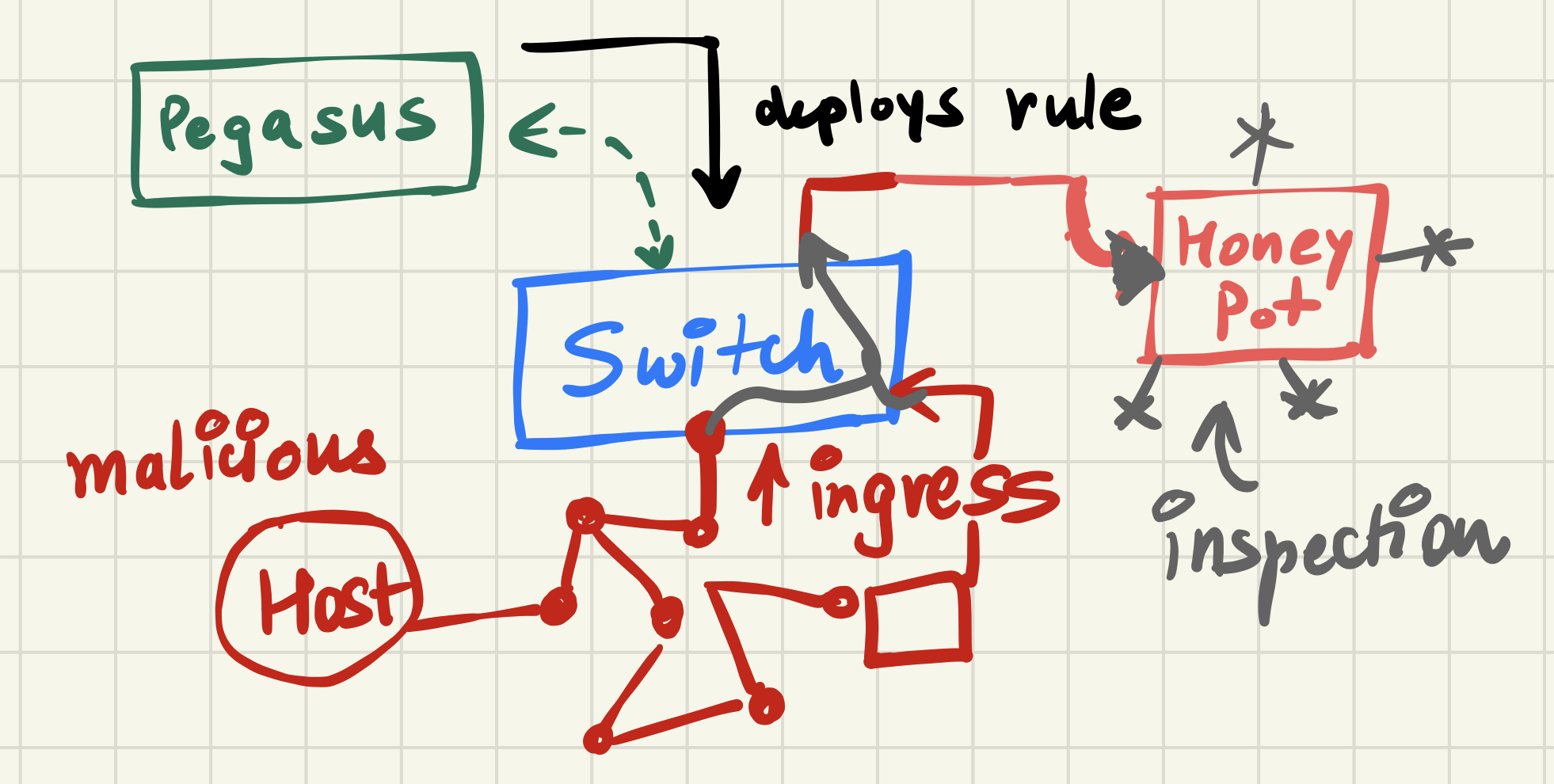 Whenever a new packet which does not follow any rule in the Actions Table arrives it sends this message to the Pegasus Controller which commands the switch to broadcast the message. With time, our Pegasus Controller learns the port to host map and then deploys appropriate rules in the switch.