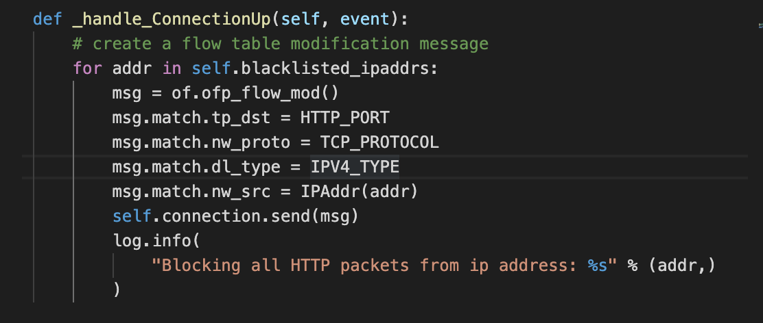 In this we basically loop over all the blacklisted_ipaddrs and block the TCP/IPv4 packets.