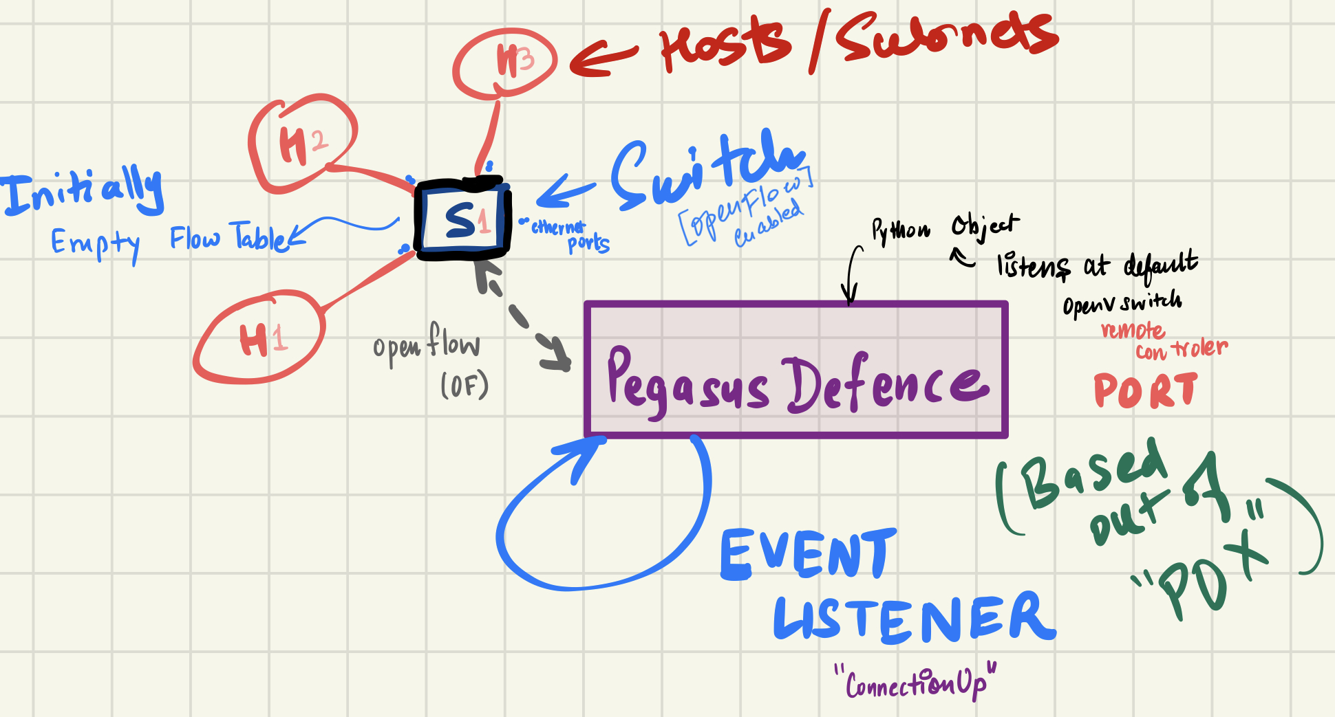 When the OpenFlow enabled switch boots up it connects itself with the Pegasus controller. And in the case of multiple switches one can use multiple controller for various usecases as described next.
