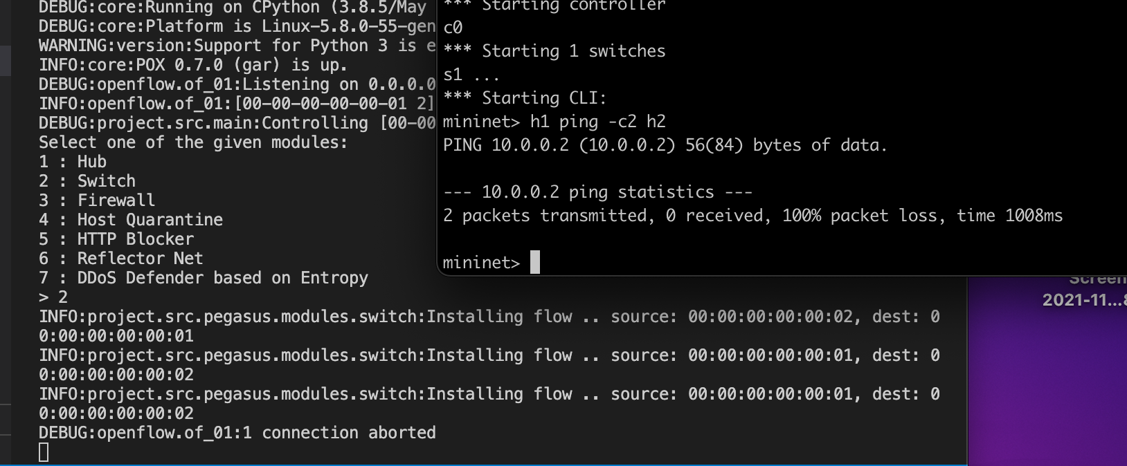 1. Move the project folder in the POX folder (which comes installed with miniet)