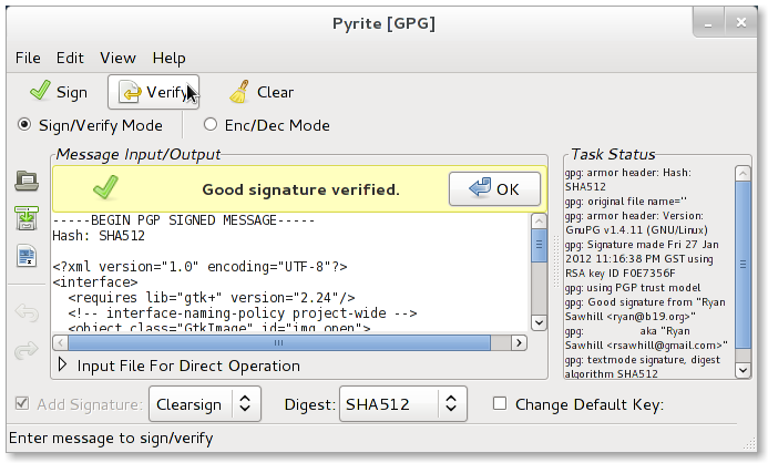 Long story short, after a couple weeks of learning, I released my first version of this project in January 2012, quickly added public-key encryption, signing, & verifying, and have been improving it ever since. This being my first learning experience with GTK+, I have lots more to learn, but I'm damn proud of Pyrite.