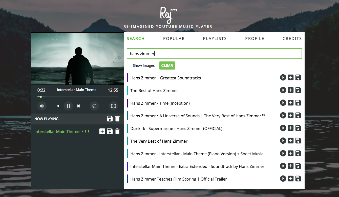 Many of us use Youtube to listen to music. But Youtube wasn't designed with music in mind. So, I created 'Rey' with simple and intuitive UI which takes youtube as data source! It is only for desktop now ( webapp and standalone app ).