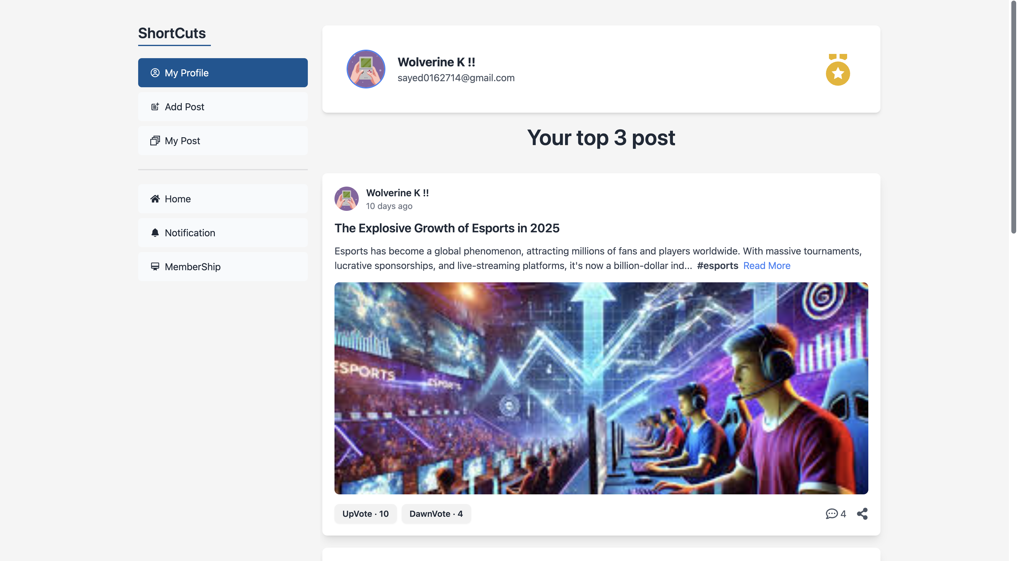 - My Profile: Displays user's name, email, badges, and 3 recent posts.