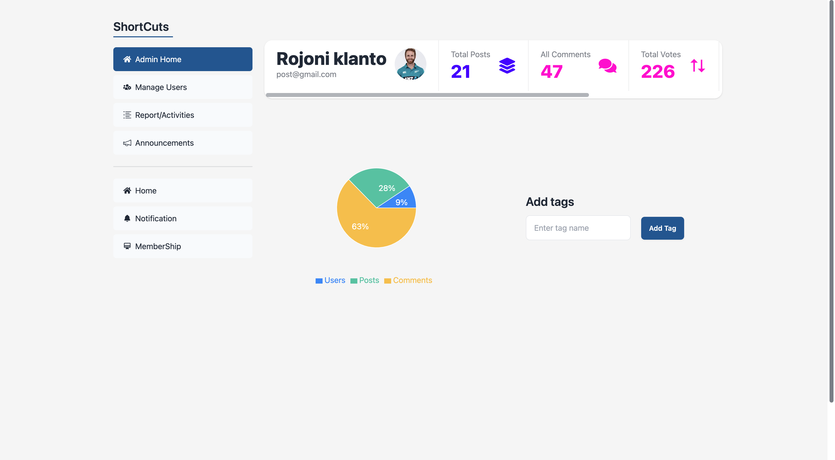 - Add Post: Post content with tags, upvotes, and downvotes.