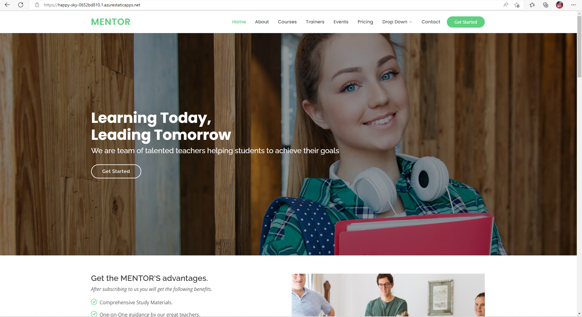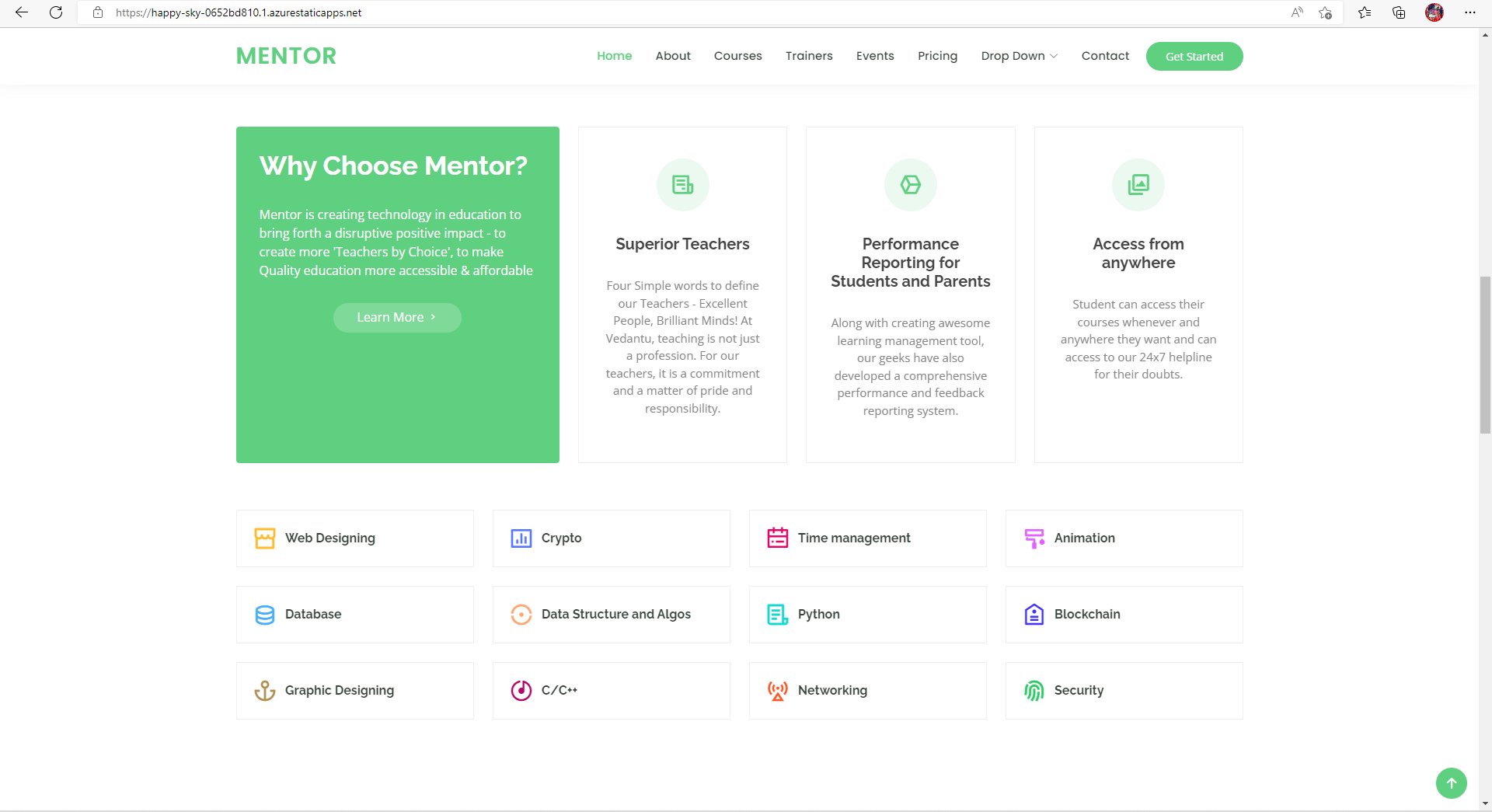 Mentor is the name given to the website. This is azure based static web app that is a educational website. This is a project for my future ready talent program.