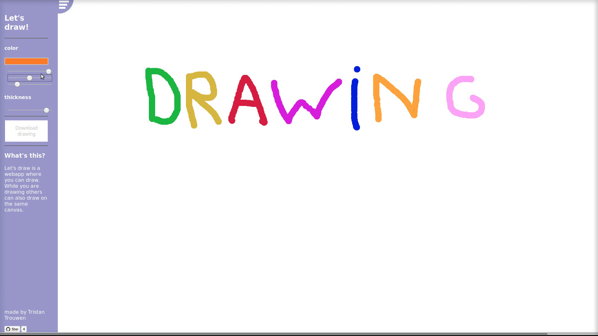 Let's draw is a webapp where you can draw. While you are drawing others can also draw. Basically you can draw with other people, all on the same canvas.