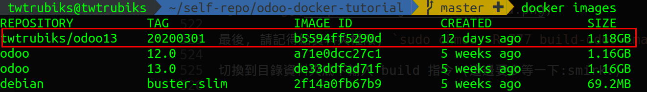 docker build -t twtrubiks/odoo13:20200301 .build 完之後, 如果一定正常, 輸入 docker images 你應該會看到下圖
