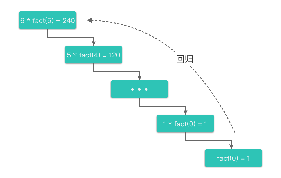 fact(6)开始,一层层地调用fact(5)、fact(4)、… 一直到最底层的fact(0)。 - 当