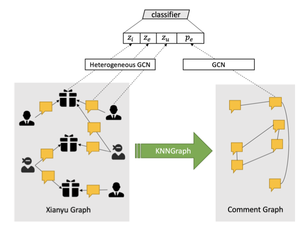 文章要解决的问题是垃圾评论检测,构建了两个图。第一个图:用户-评论-商品图,是异构图;第二个图:评论-评论图,是同构图。分别用异构GCN和GCN学到各自的表征,做节点分类工作。